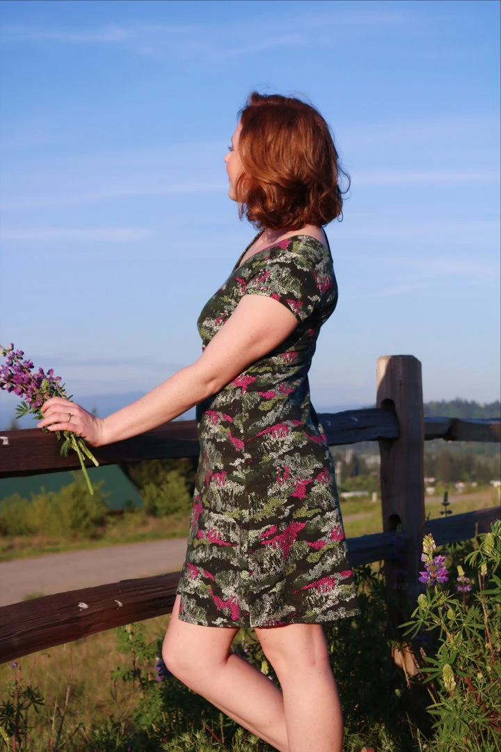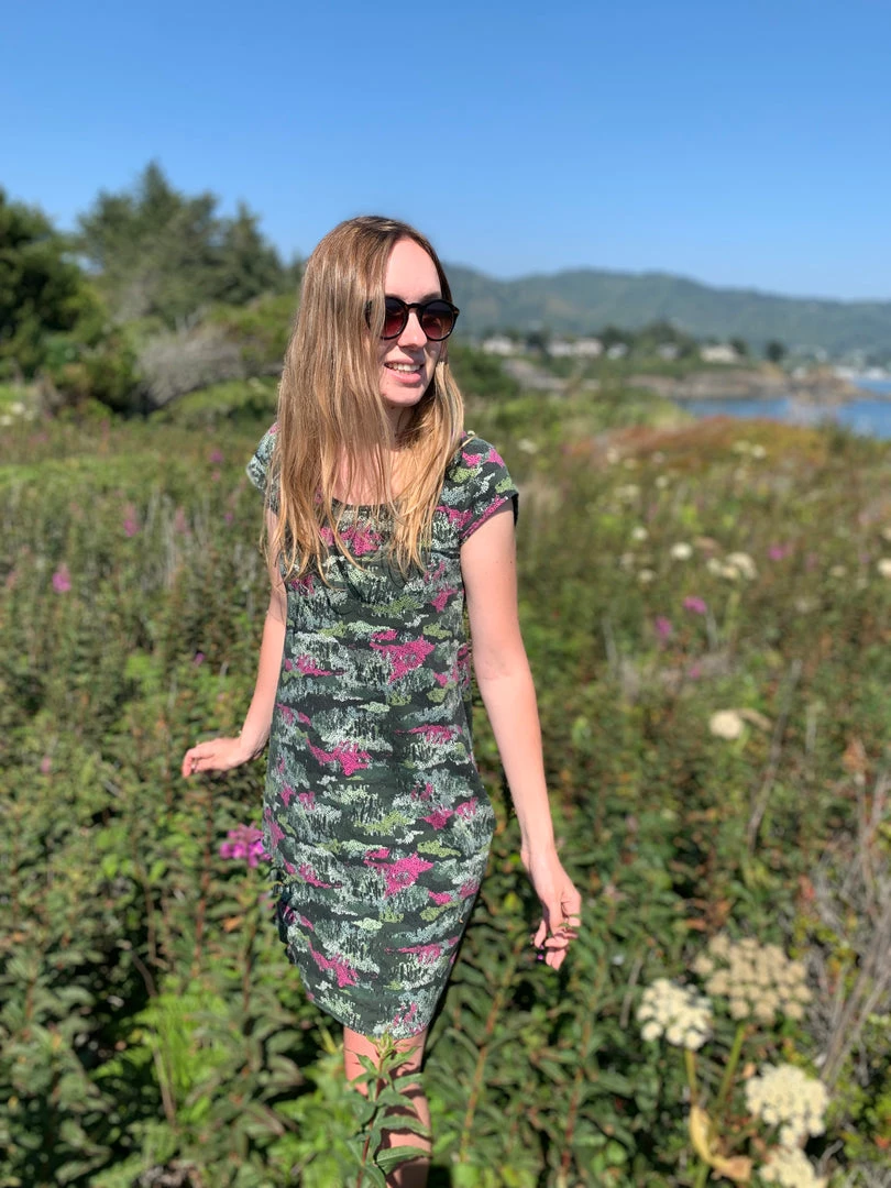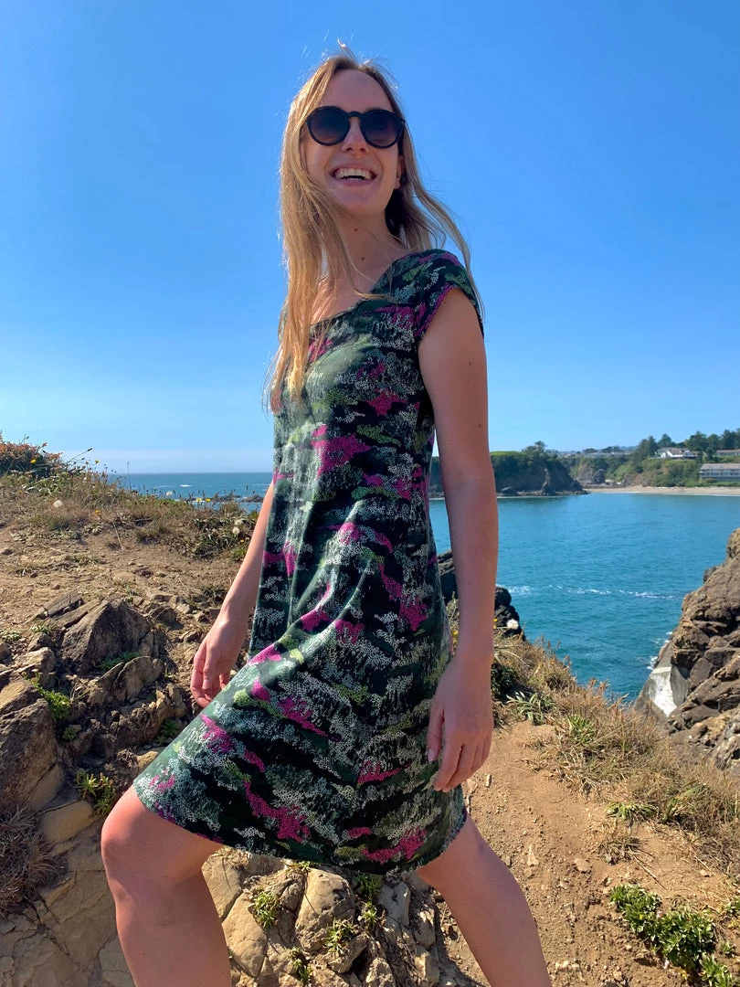 This is the perfect summer dress for those days you would prefer to walk around in your comfy tee shirt all day, yet you want to look fabulous! This A-line dress is designed so you have a choice to wear the low scoop in front or in the back, just turn it around and you’ll see one side is cut higher than the other giving you just a little more versatility. The swing dress cut flows across your body in the most flattering way. It shows you have a body without hugging it, making it an ideal choice for summer travel. We at a.ell design made this island style dress in our Portland, OR atelier.