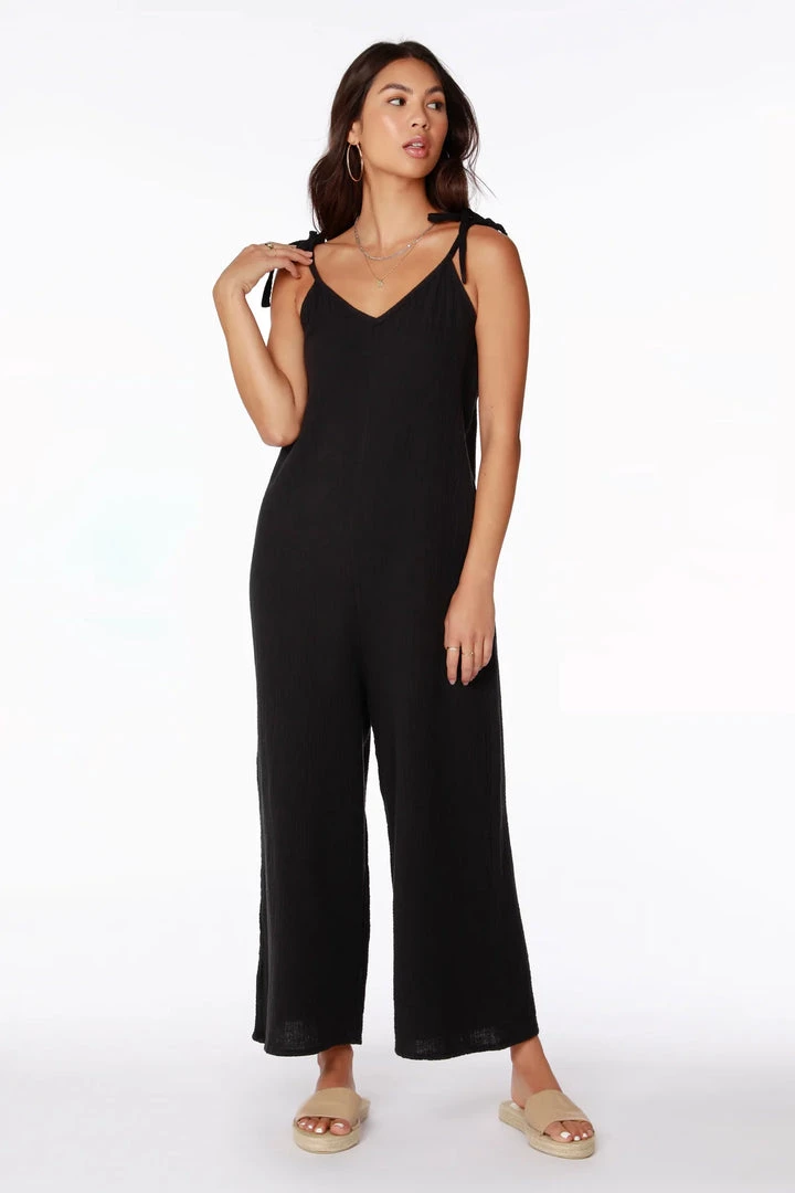 This easy-fit jumpsuit features adjustable tie straps, a flattering v-neck, and wide-leg pants. Wear it alone or layer it over any of your favorite tops, bralettes, or swimsuits.
