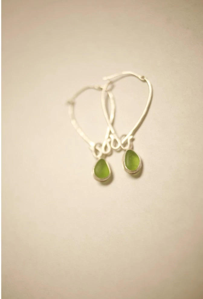 The Gorgeous Sterling Silver Hoops are handmade by Catlin Ross Odom on the North Shore of Kauai. She collects the beach glass and shells from the Kauai beaches and creates the most beautiful line of Island jewelry. Purchase the hoop of your choice here.Â