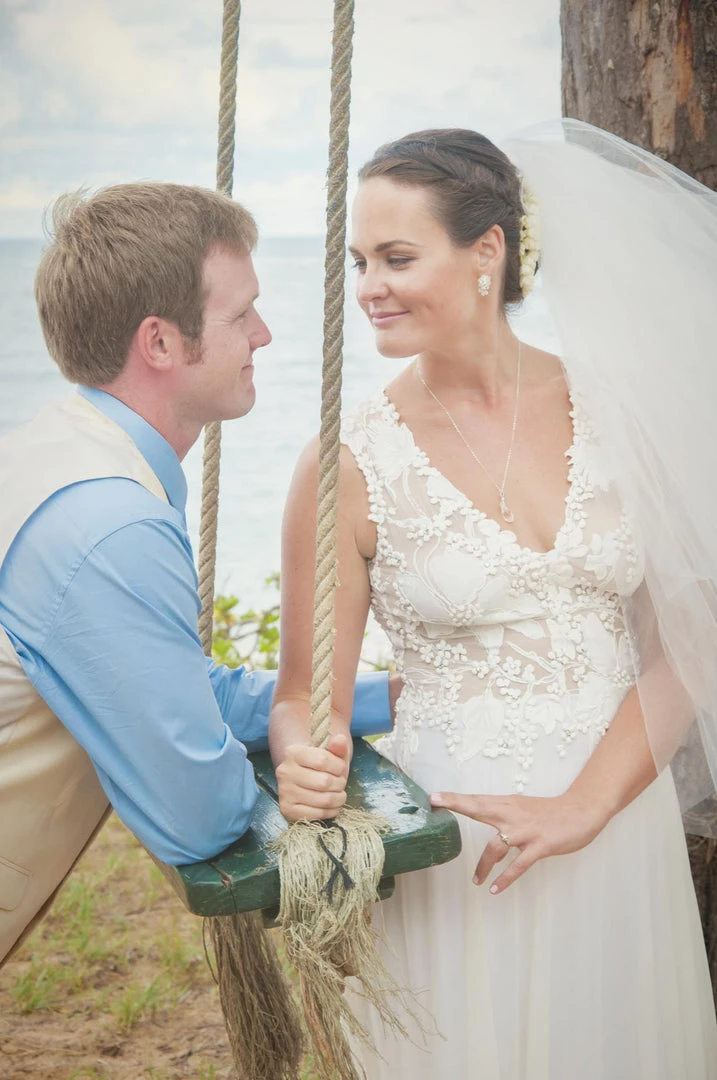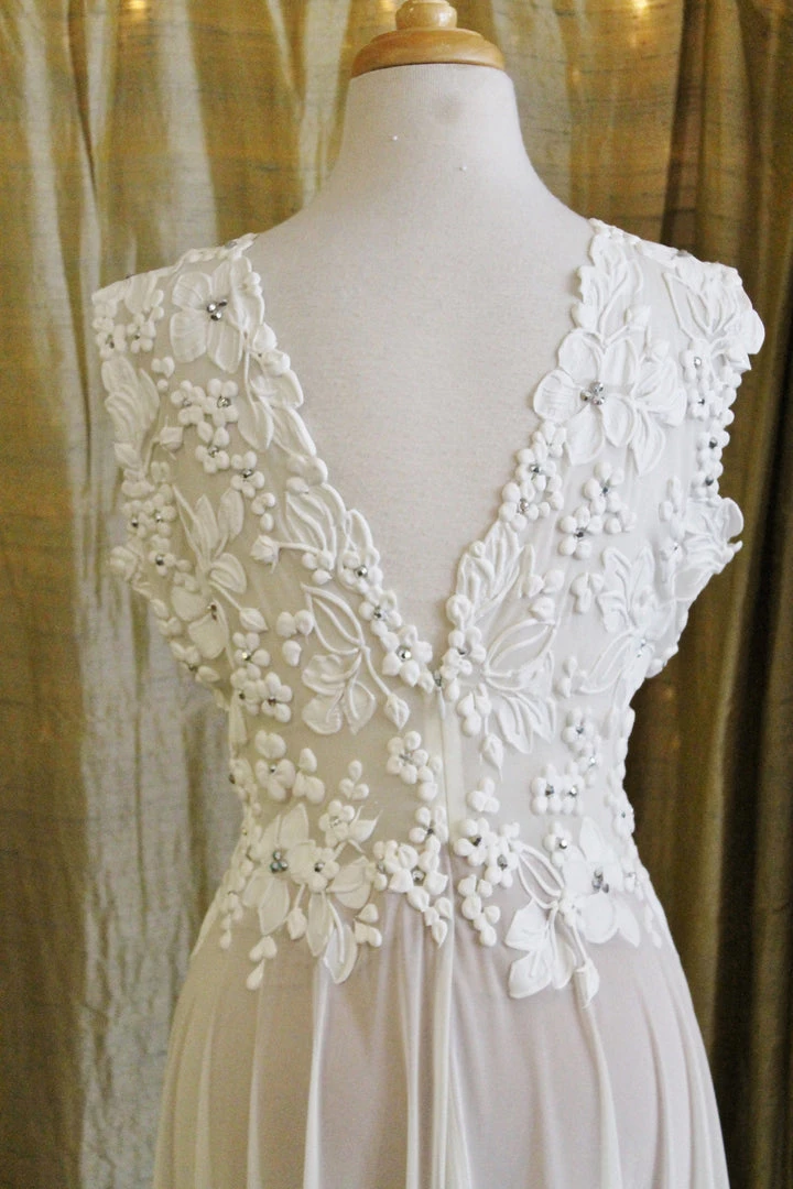 This beautiful masterpiece is a one of a kind hand painted dress with an elegant v-neck and full back. It’s full length and even has painted straps. You can request your own paint color or choose from our in-store colors.