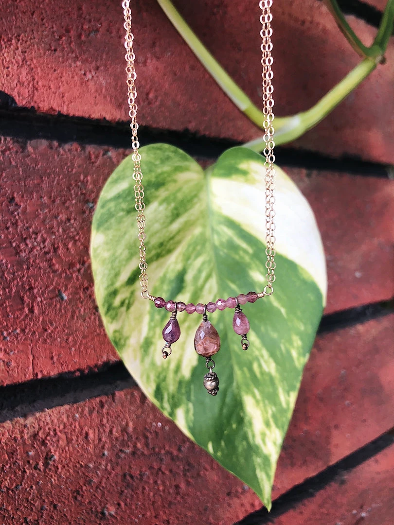 Pink sapphire and tourmaline on a 14k gold fill double chain. This necklace is one of a kind and handmade locally on Kaua`i.