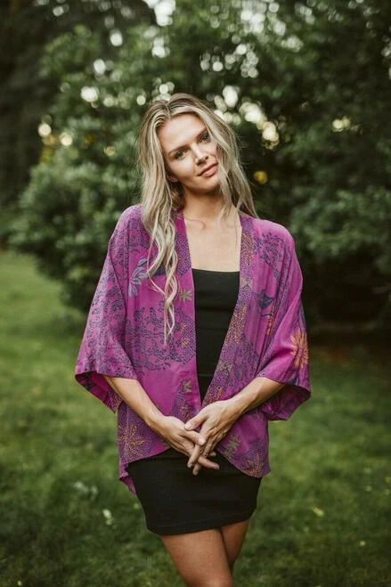 A gender-neutral shrug, featuring a tuxedo shawl collar, hi-lo hem, batwing sleeve, and wrap and tie closure for a customizable fit. This piece is perfect for any activity, from yoga to business meetings.Â