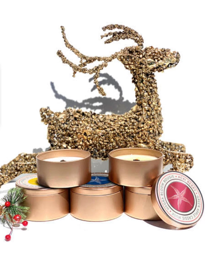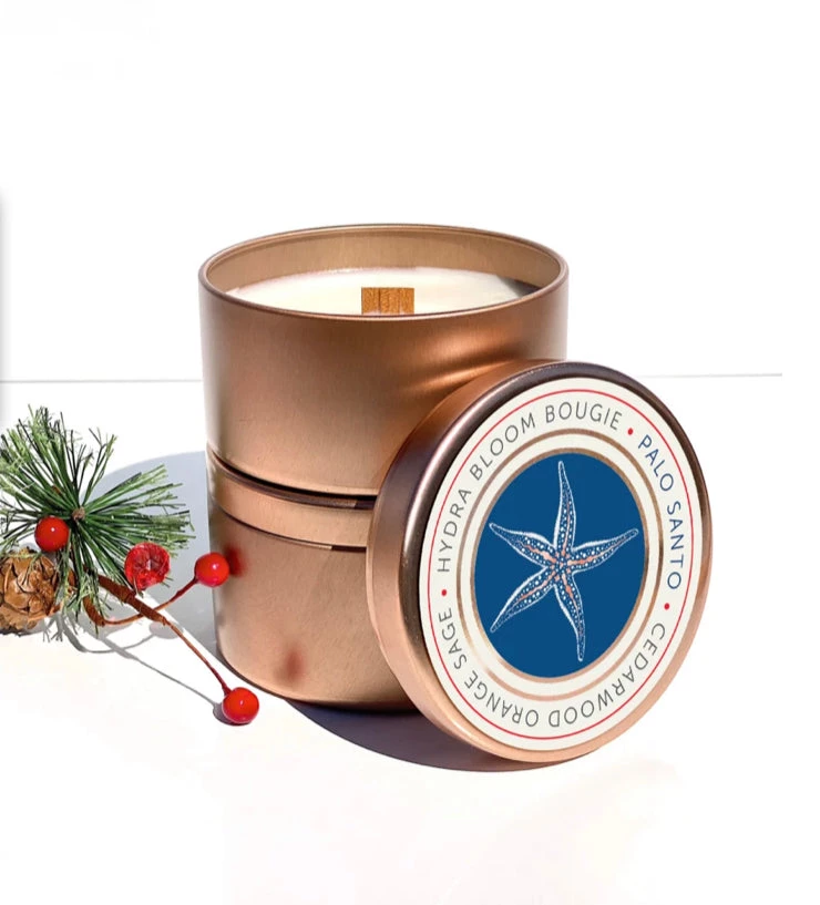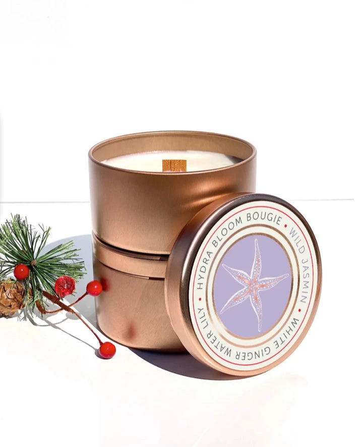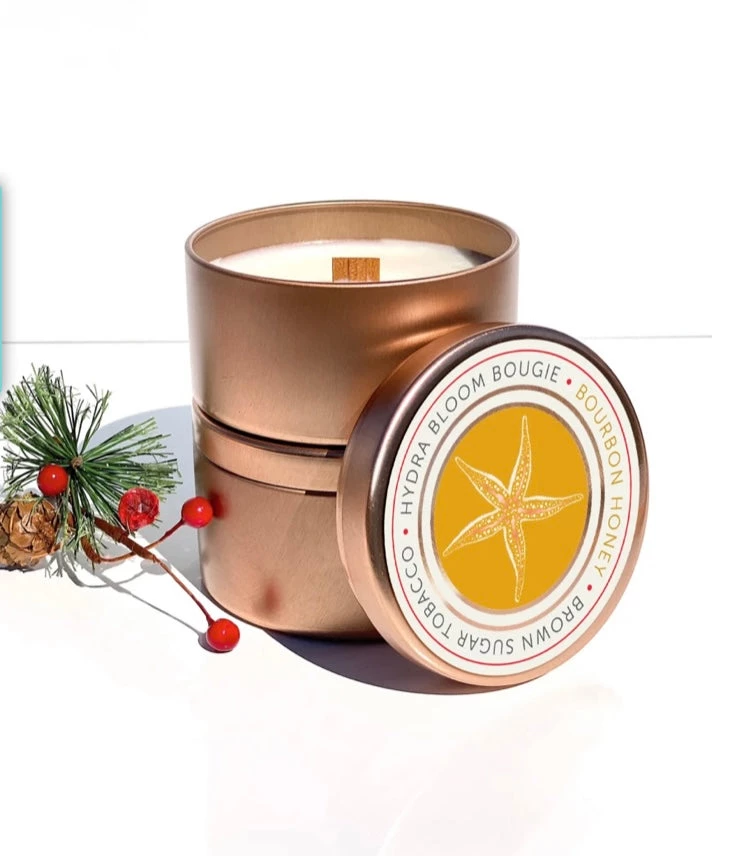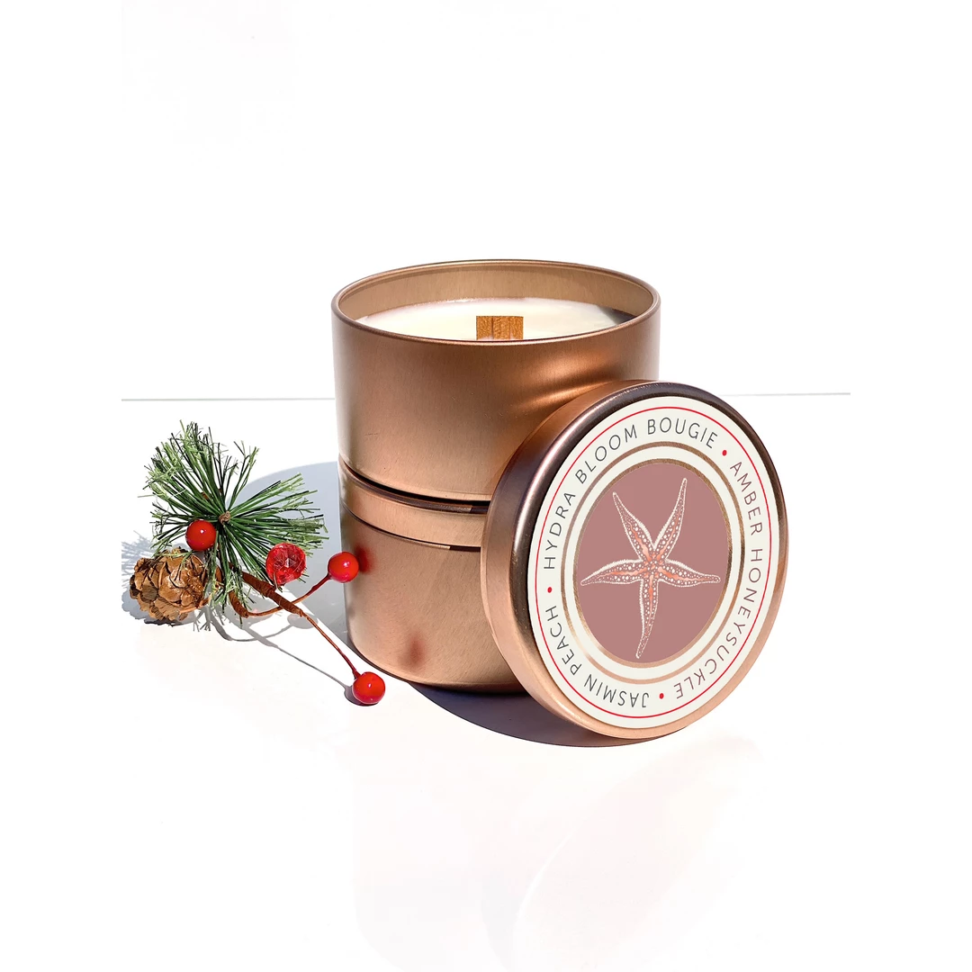 A copper tin with lid filled with a luxurious blend of Coconut and Soy wax with soy wooden crackling wicks.