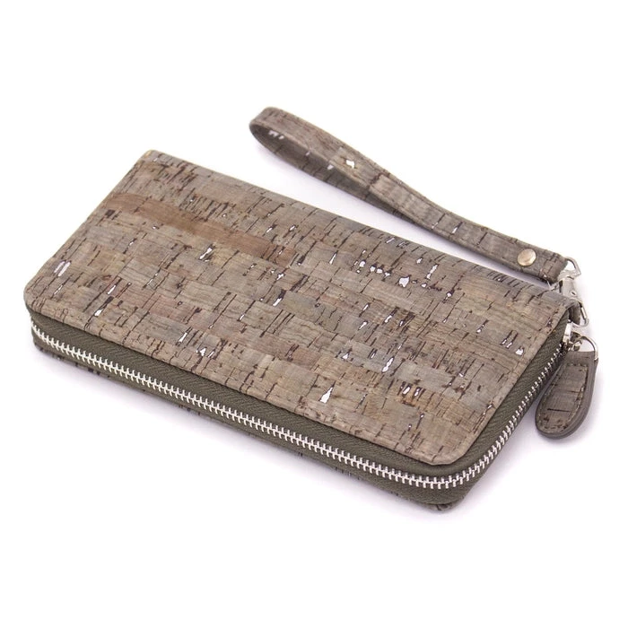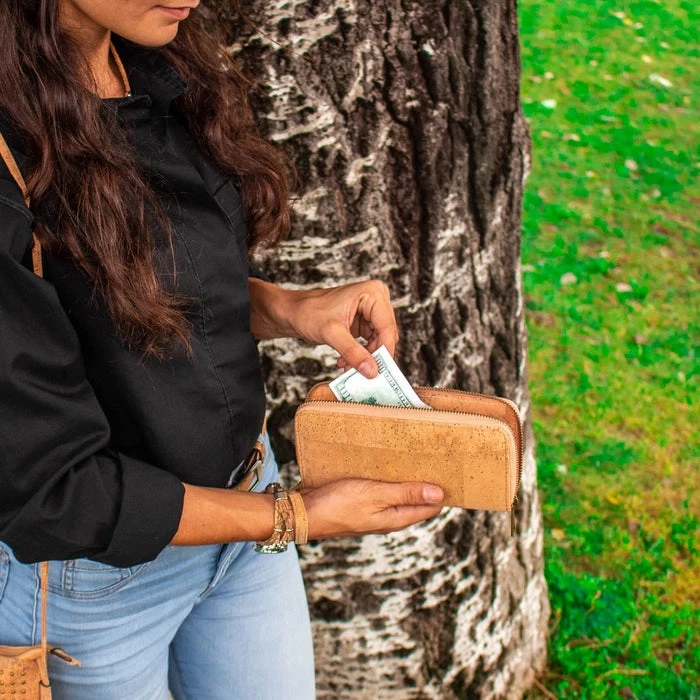 This Cork zipper wallet has a top zipper for convenient access. This beauty has everything you would want in a vegan wallet and more including 4 card pockets, 1 zipper coin pocket, 2 bill pockets, 2 cash pockets and a compartment for your phone.