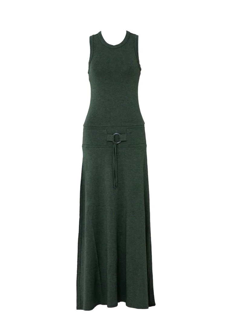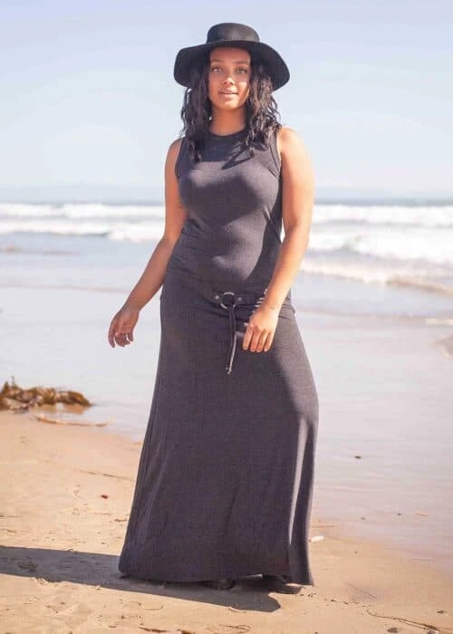 Like a cool drink of water from a crystal spring, the Thalia Dress in Bamboo Melange will quench your thirst for an elegant sustainable maxi dress for all seasons. Casual enough for the day, with a simple scoop neck and wide T back, but dress it up and it’s “look out nighttime”! Faux belt on the hips with metal O ring and long tassels topped with metal beads.