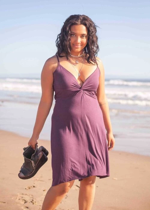 The Nebula Dress looks great on girls with curves. The fabric is doubled in the bodice and can provide quite a lot of support. Great for the beach, or for dinner, either way. The A cut is very flattering on many body types.