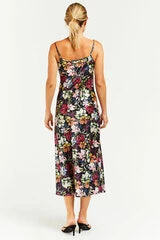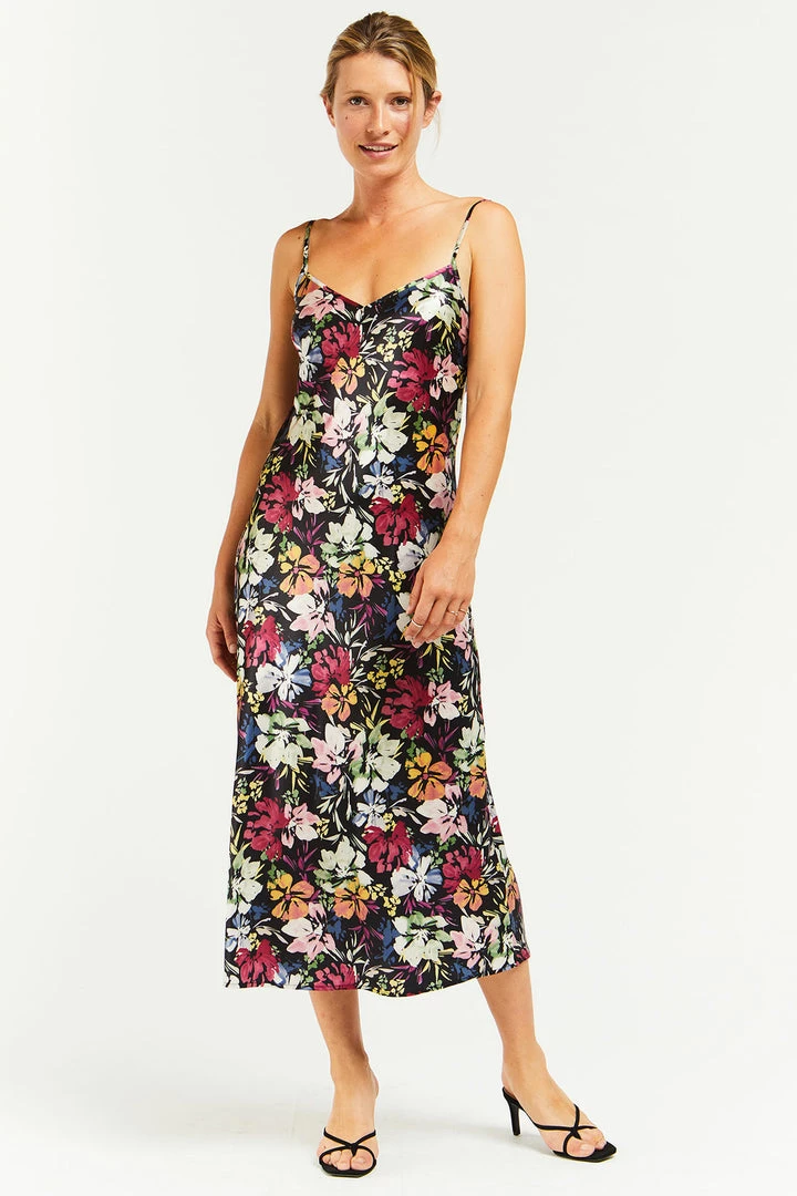 A smooth floral slip on dress—ideal for an elevated look. This dress features adjustable straps and a v neckline.